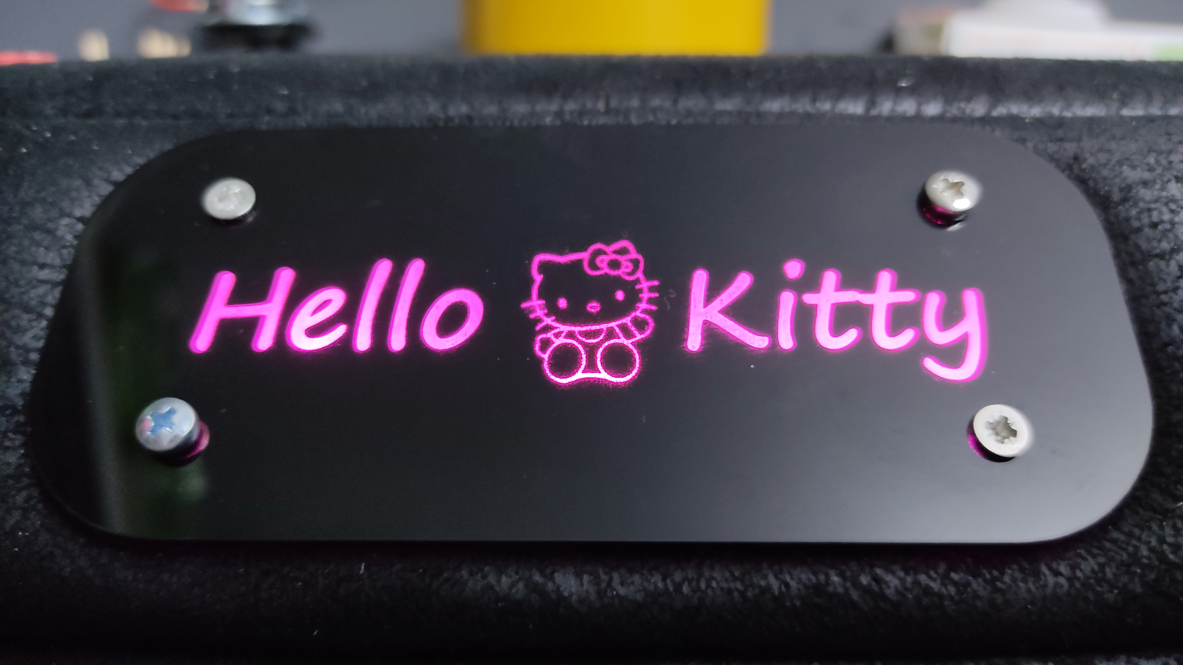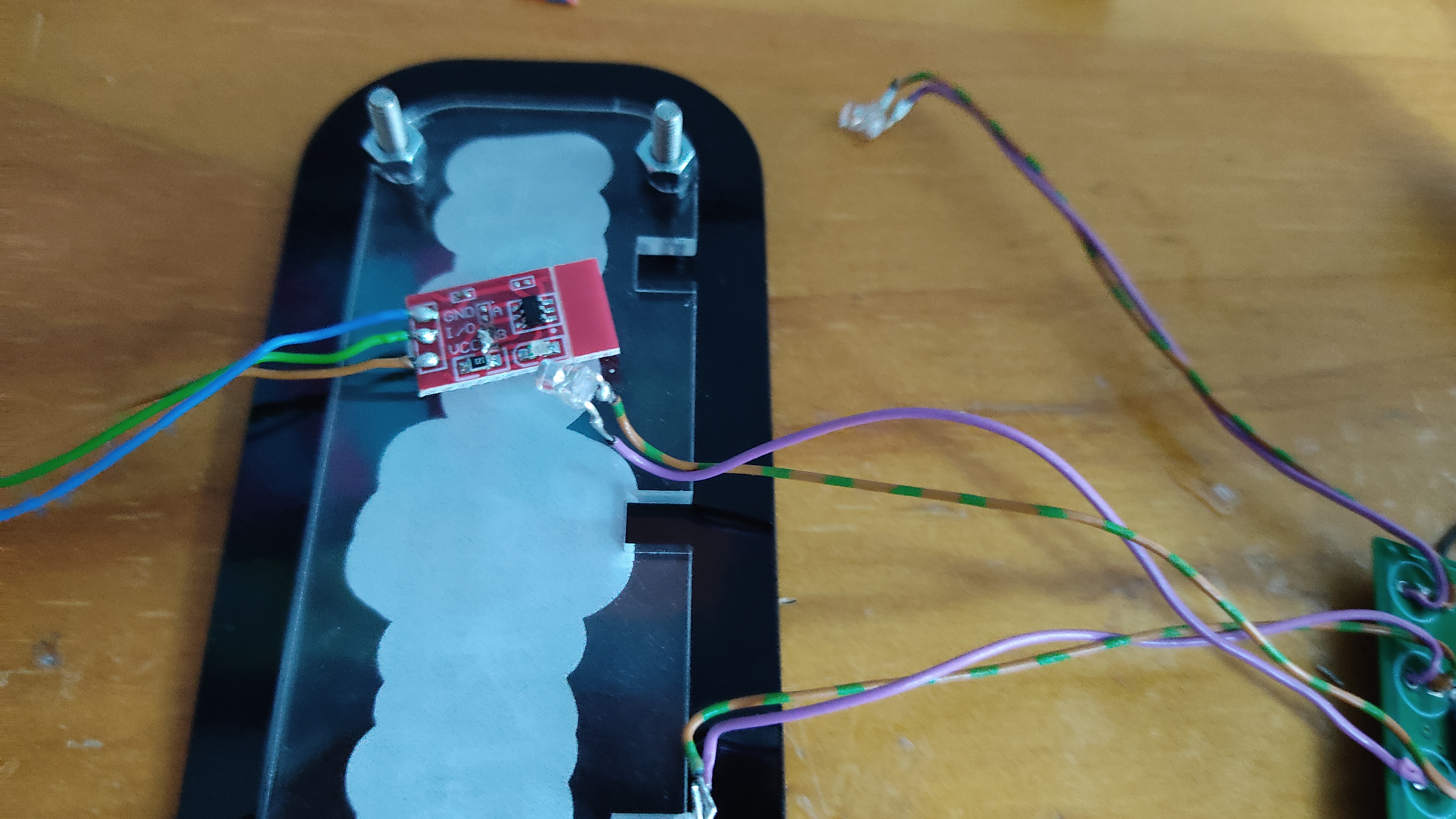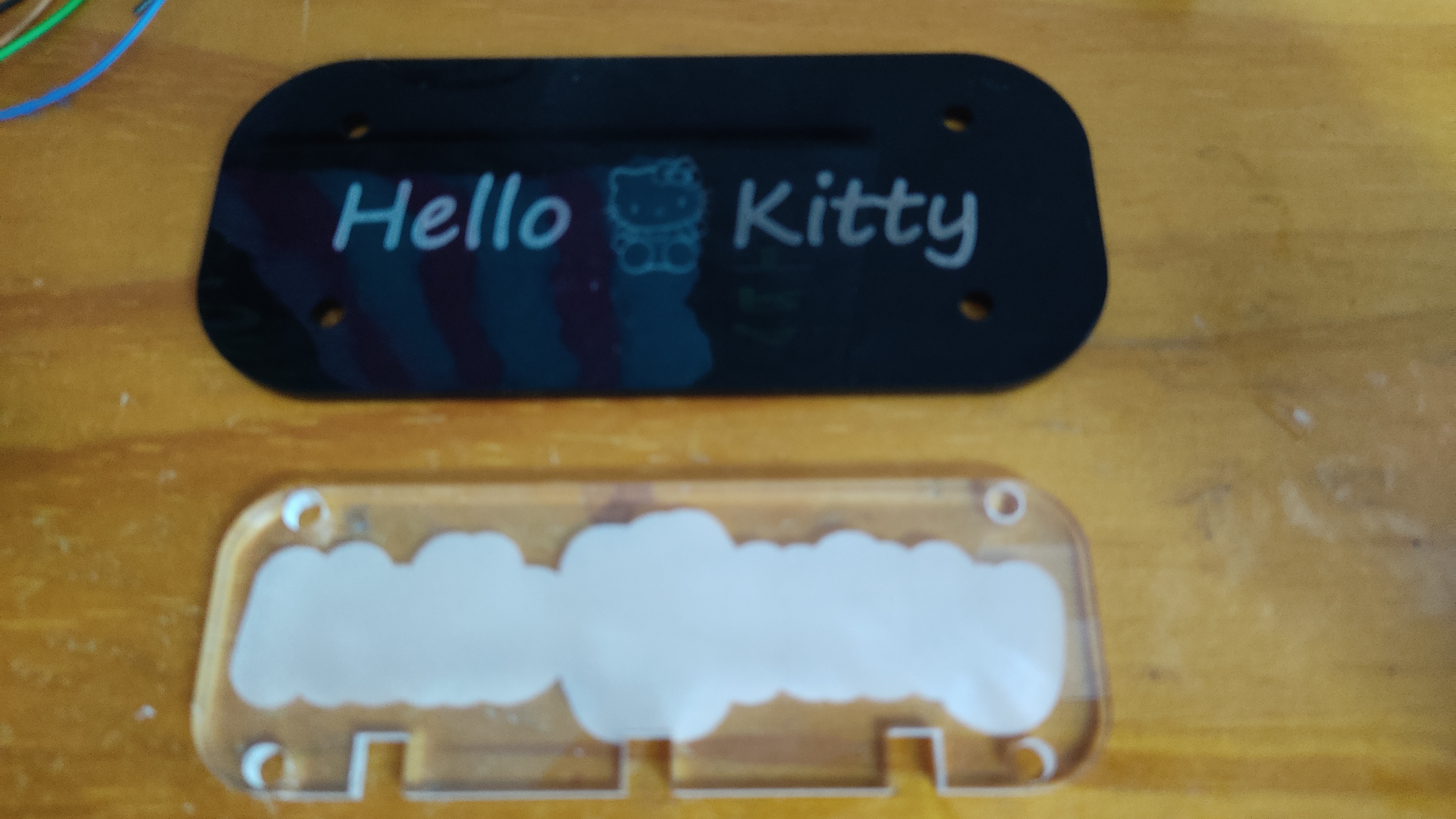 The power switch was a little bit more compilcated. The front part is clear 3mm acrylic painted in black. With the laser cutter, the text and the kitty were engraved on the painted backside. A second acrylic part is used to hold the pink LED’s and to diffuse the light. On this part a TP223 module is glued. It’s a capacitive switch. The two points, labeled B, have to be shortened, to set the module in toggle mode.