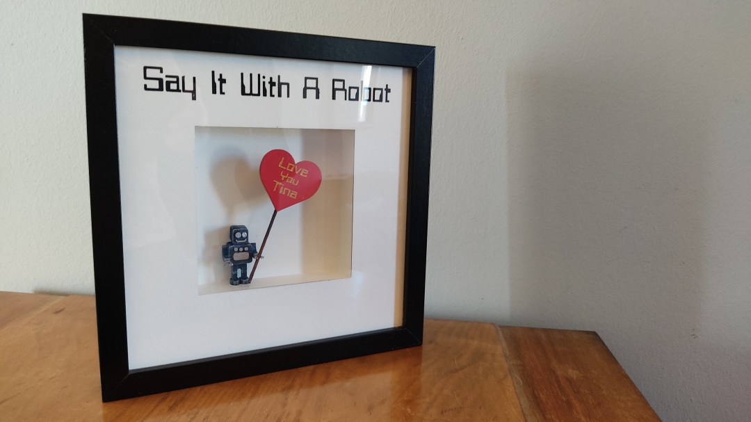 I used an IKEA Ribba frame, an I glued this laser cut frame on the back-plate The two robots were made out of 4mm plywood, an painted with acylic paint After all the back is painted in white, the robot was glued in place Again, 4mm plywood for the message heart All together and I … Continue reading A small valentine gift for my wife