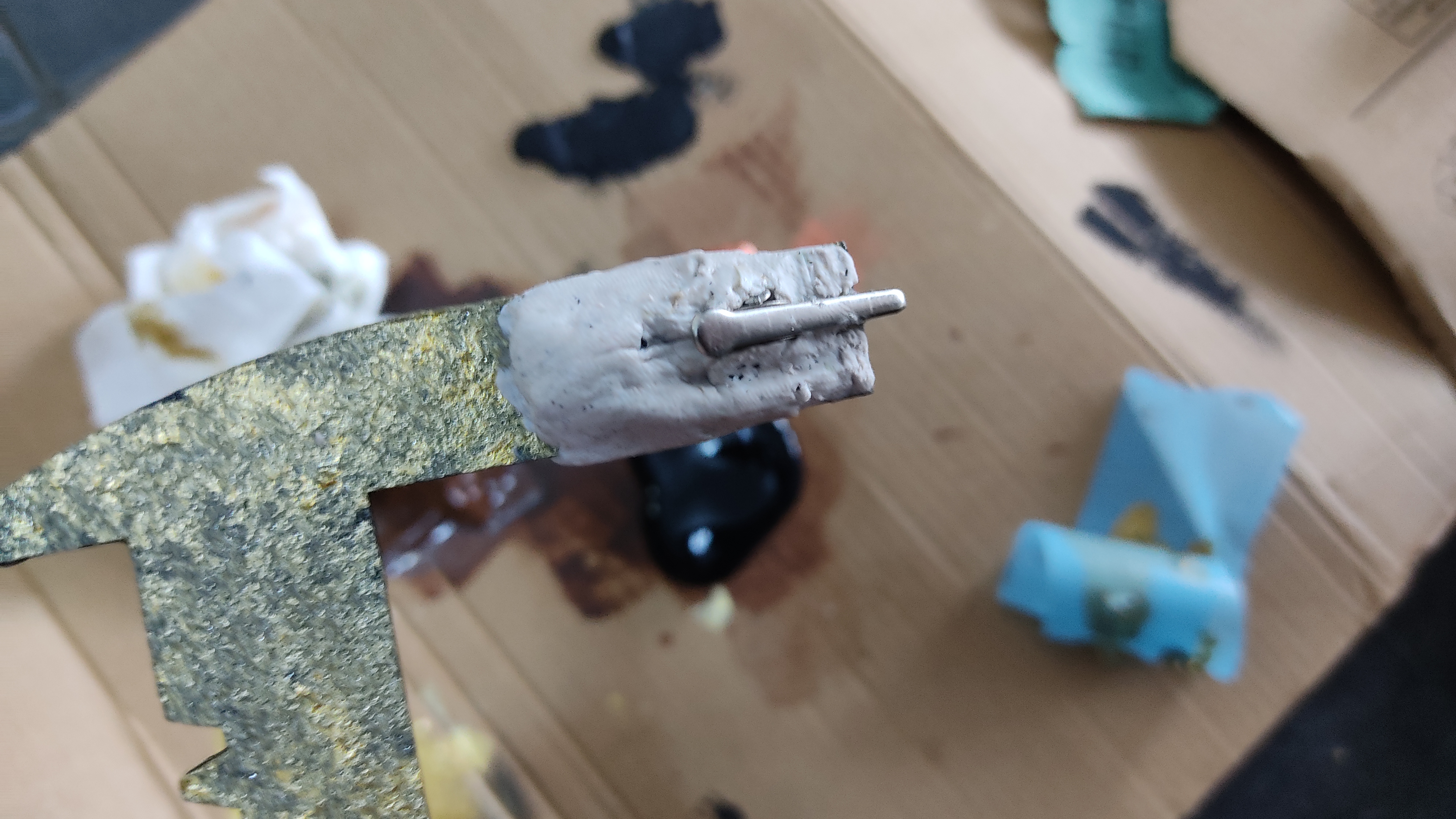 All the parts were painted with acrylic colors. To attach the teabag, I used a alligator clip and I glued it with epoxy,