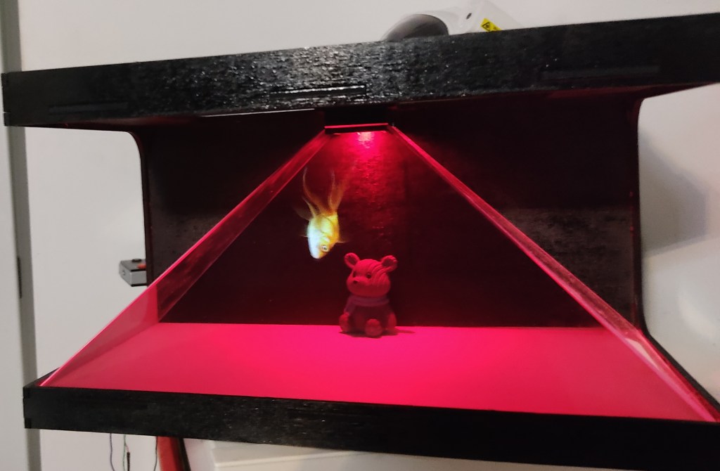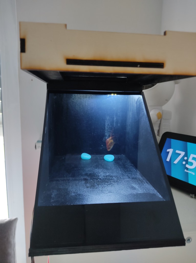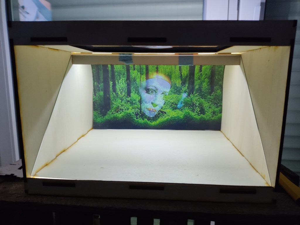 I have been working with this effect for a long time and have already built a few boxes. But I was never satisfied with the result because the reflection was not perfect. After analysing some professional holodisplays for advertising on the internet, i noticed that the glass was not completely transparent, and therefore there was also a light behind the screen.