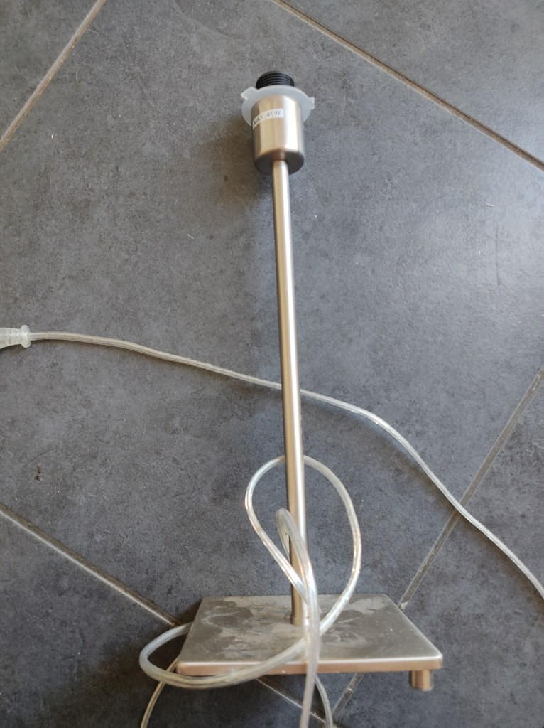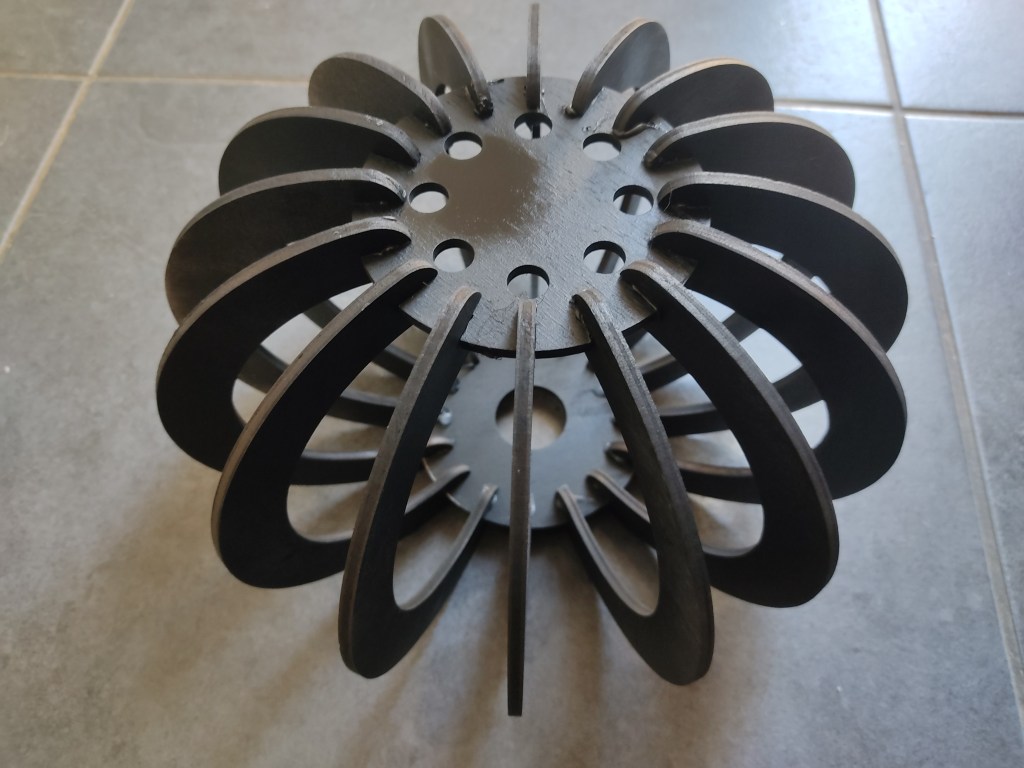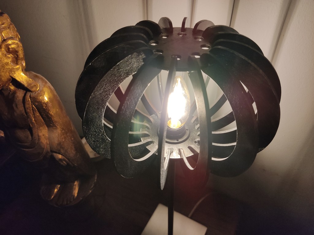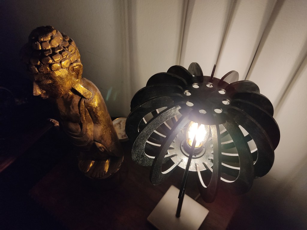 Found this little floor lamp in the trash. After a 10min crash design on the computer and with the help of my laser cutter, it turned out better than I thought. The lampshade is made of 4mm plywood. I sprayed the whole thing black and glued it together. Then I applied a metallic look with silver acrylic paint and the new lamp was finished.