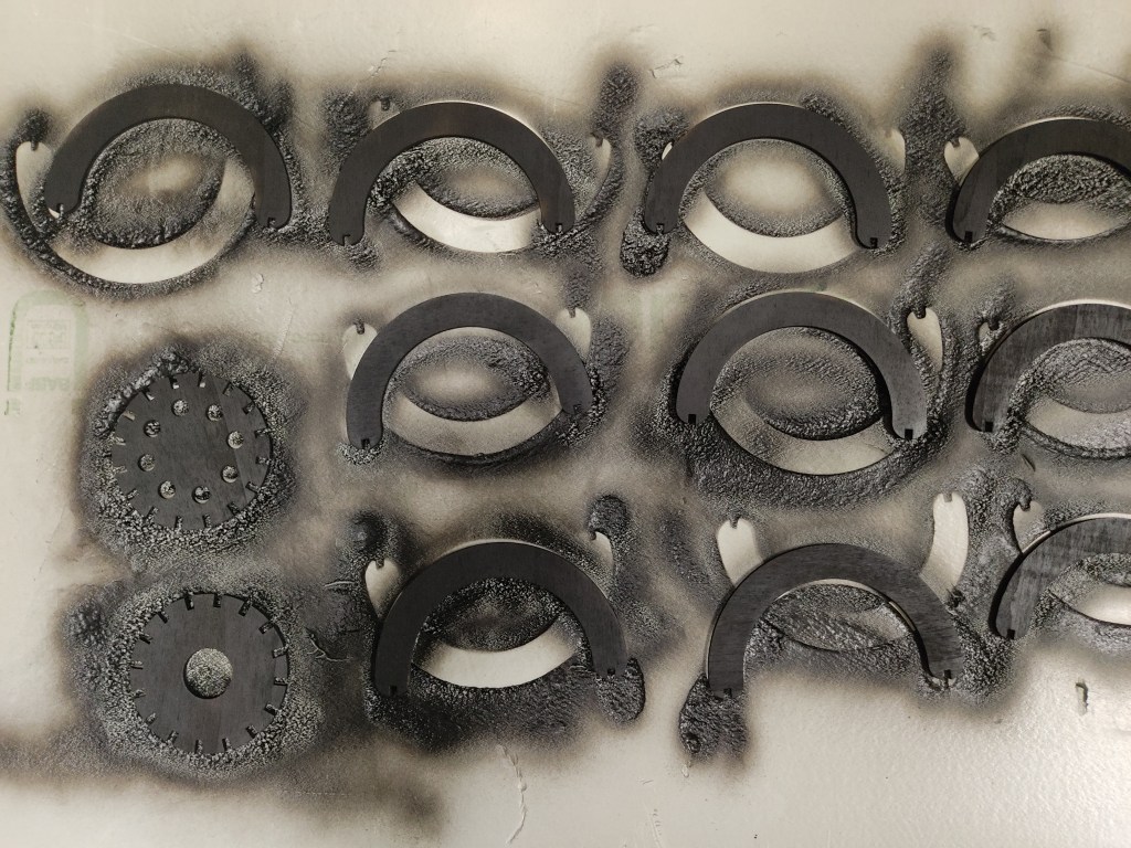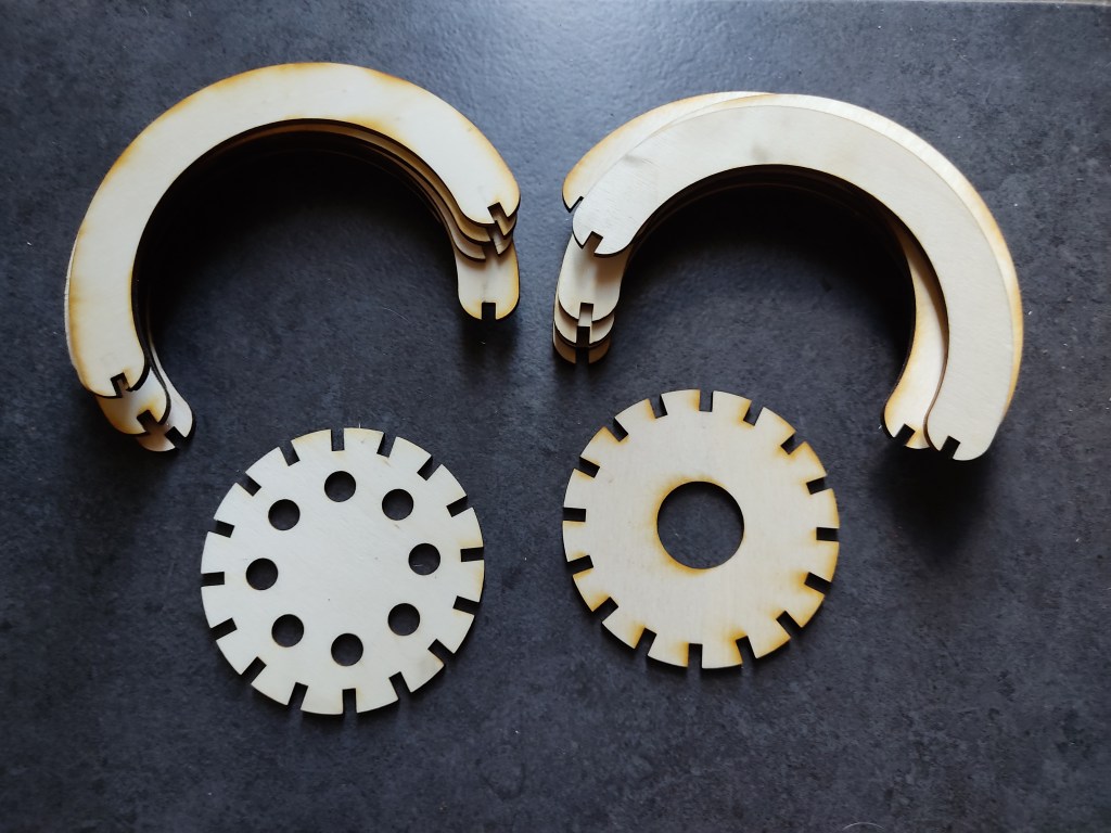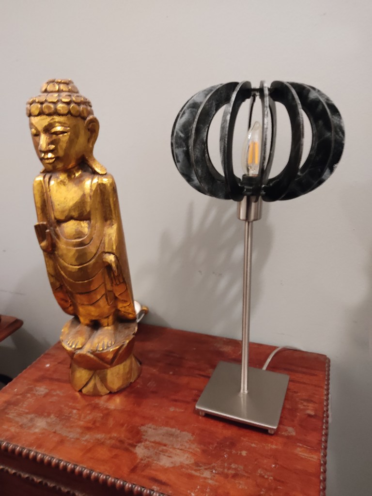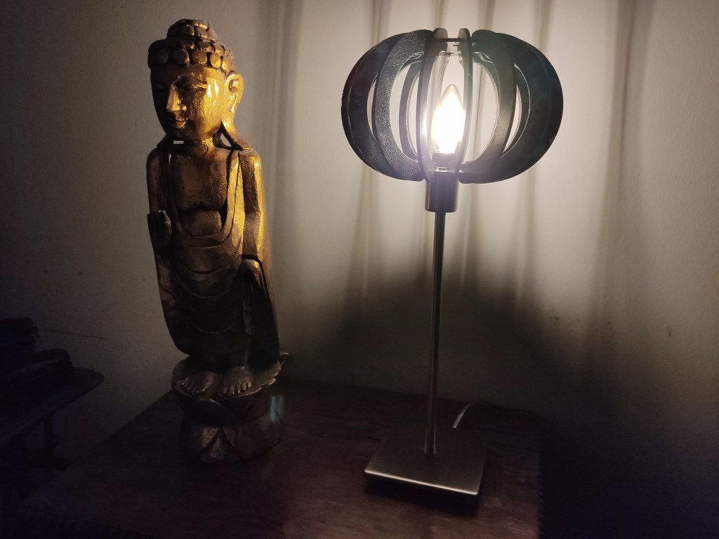 Found this little floor lamp in the trash. After a 10min crash design on the computer and with the help of my laser cutter, it turned out better than I thought. The lampshade is made of 4mm plywood. I sprayed the whole thing black and glued it together. Then I applied a metallic look with silver acrylic paint and the new lamp was finished.