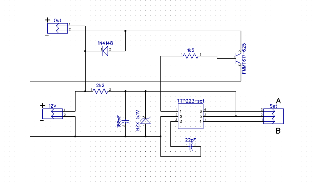 First the schematic. I also included a flyback diode in the design, so you can also directly control a relay. The TTP223 chip has the same components as on the small original board. As on that, the 22pf capacitor is optional and is used to control the sensitivity of the touch controller. An FMMT617-625 comes into play as the transitor. You can also use another one. However, according to the data sheet, this one delivers 18V 3A. But I won’t go over 2.5A, just to be on the safe side 🙂