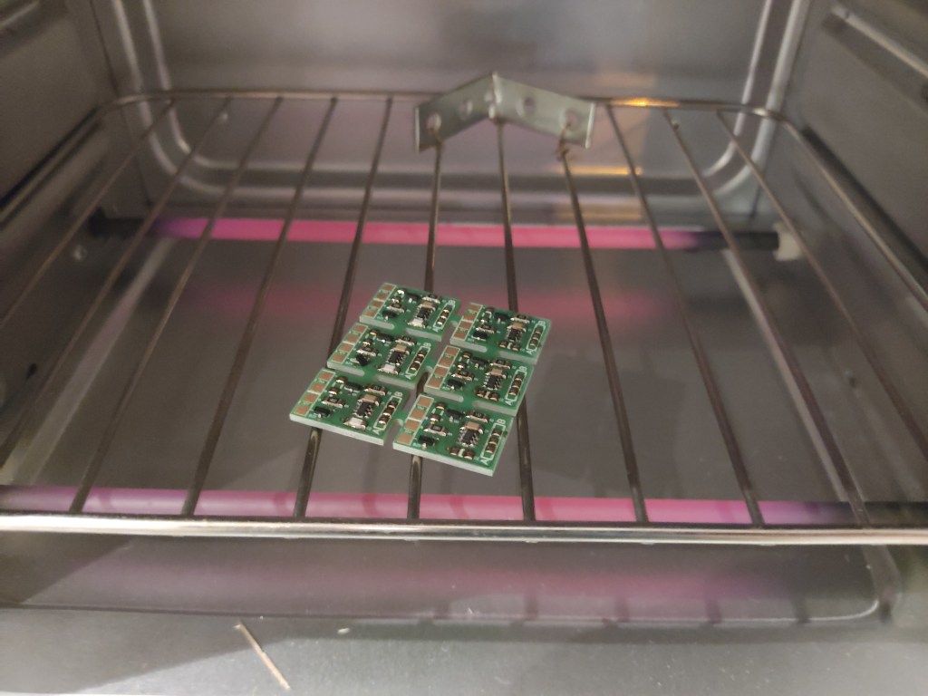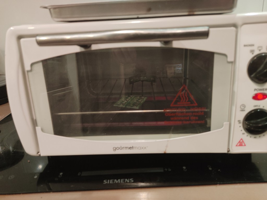 After the soldering paste is applied and all components are positioned with the help of tweezers, the whole thing goes into my unmodified 15€ pizza oven for +-10min.