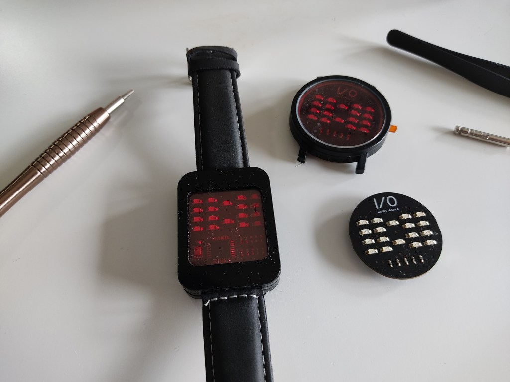 When the button is pressed, the watch starts with an animation and then displays the 24 hour time in binary. If you press it again then it displays the date. DD-MM.