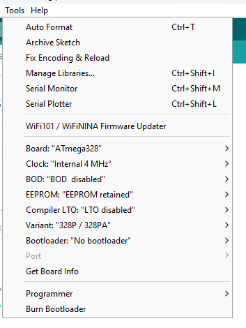 Clock “Internal 4Mhz” (if there are problems with the upload, I always solder a 16MHZ temporarily quartz on the two test Xtal pins).