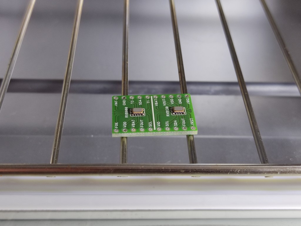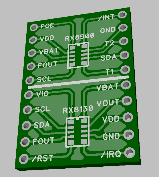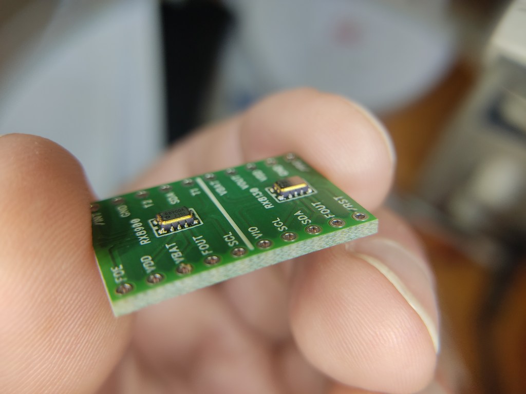 Since I’ve been on a bit of a clock trip lately, and these little things are really tiny, I decided to create a test board for these two chips, the Epson RX8900 and the RX8130.