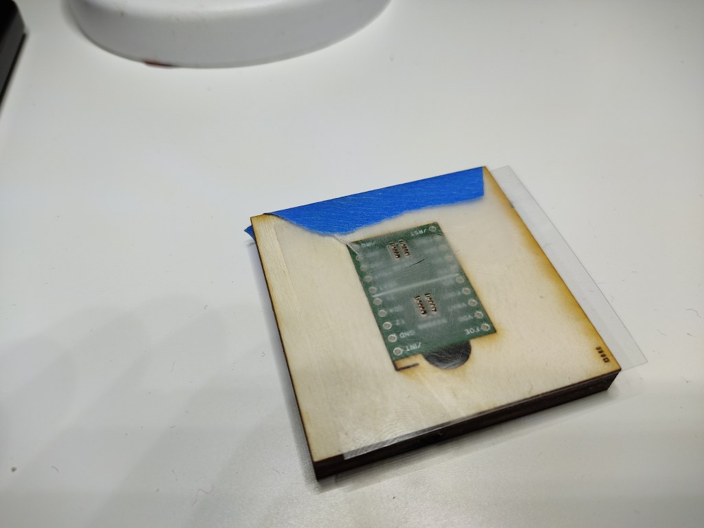 I had the circuit board made. With the help of my laser cutter, I lasered the stencil from an overhead foil and from 4mm plywood wine holder.