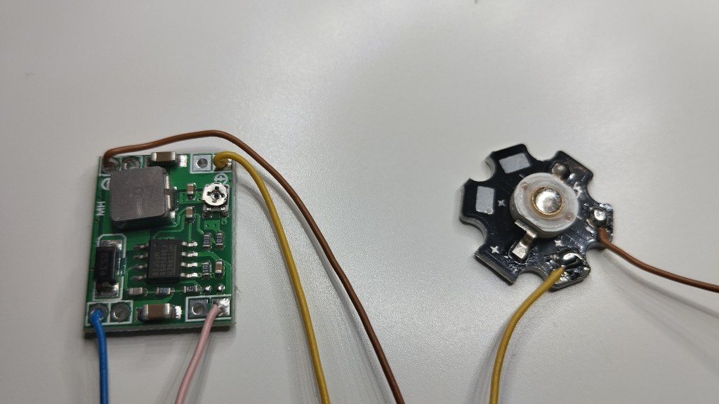 Connect an input voltage of 5-25V to the MP1548 and adjust the output voltage down to 3.2V using the trimmer on the module. Now connect the high power LED. As you can see, it works.
