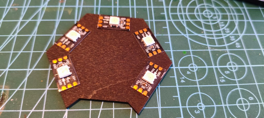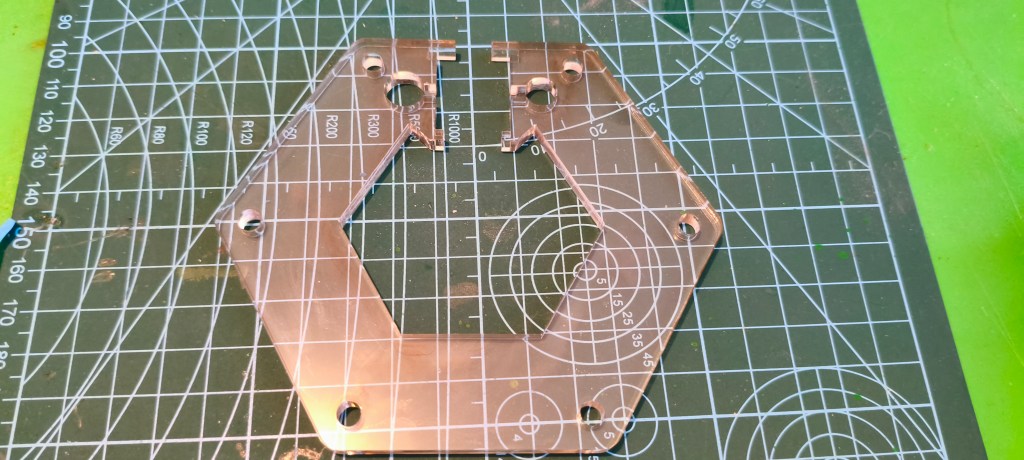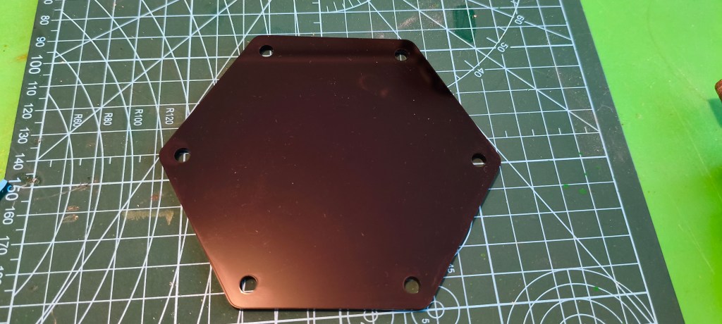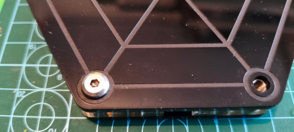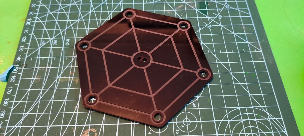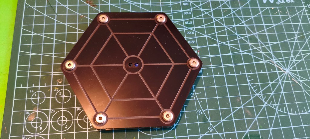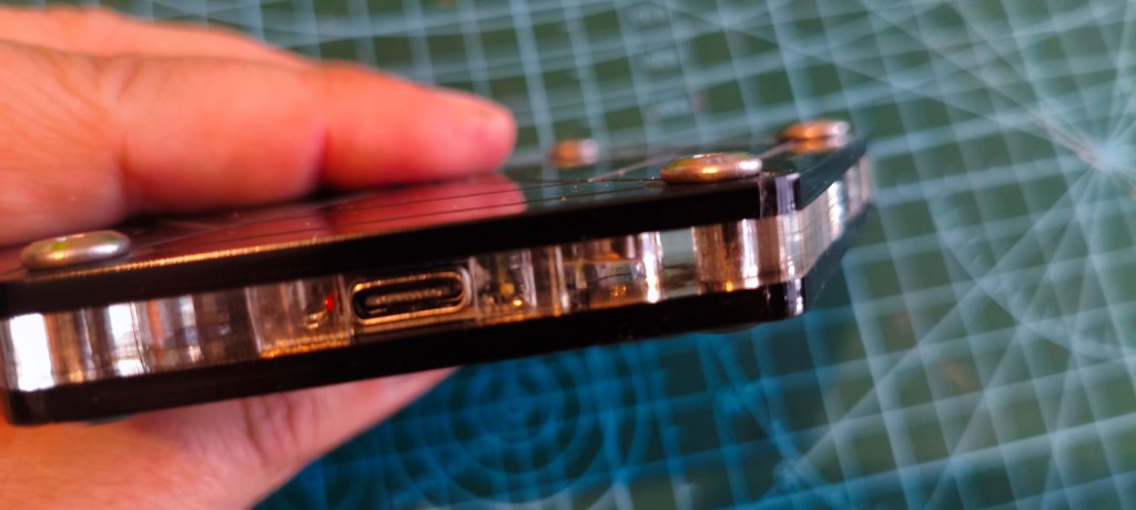 For the top and bottom sections, I chose 3mm black plexiglass, and for the middle section, 5mm clear plexiglass. A hexagon shape was laser-cut out. A 1mm-thick piece of acrylic was used to cover the USB-C port. Six M4x10mm sleeve nuts and sleeve screws were used to connect the parts.